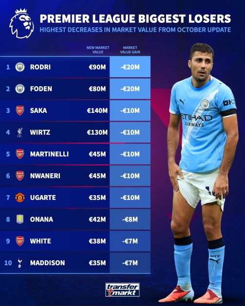 在10月17日,德转更新了英超球员的市场身价,其中罗德里和福登的身价跌幅最大,各自下降了2000万欧元。现阶段,罗德里的身价为9000万,而福登则是8000万。